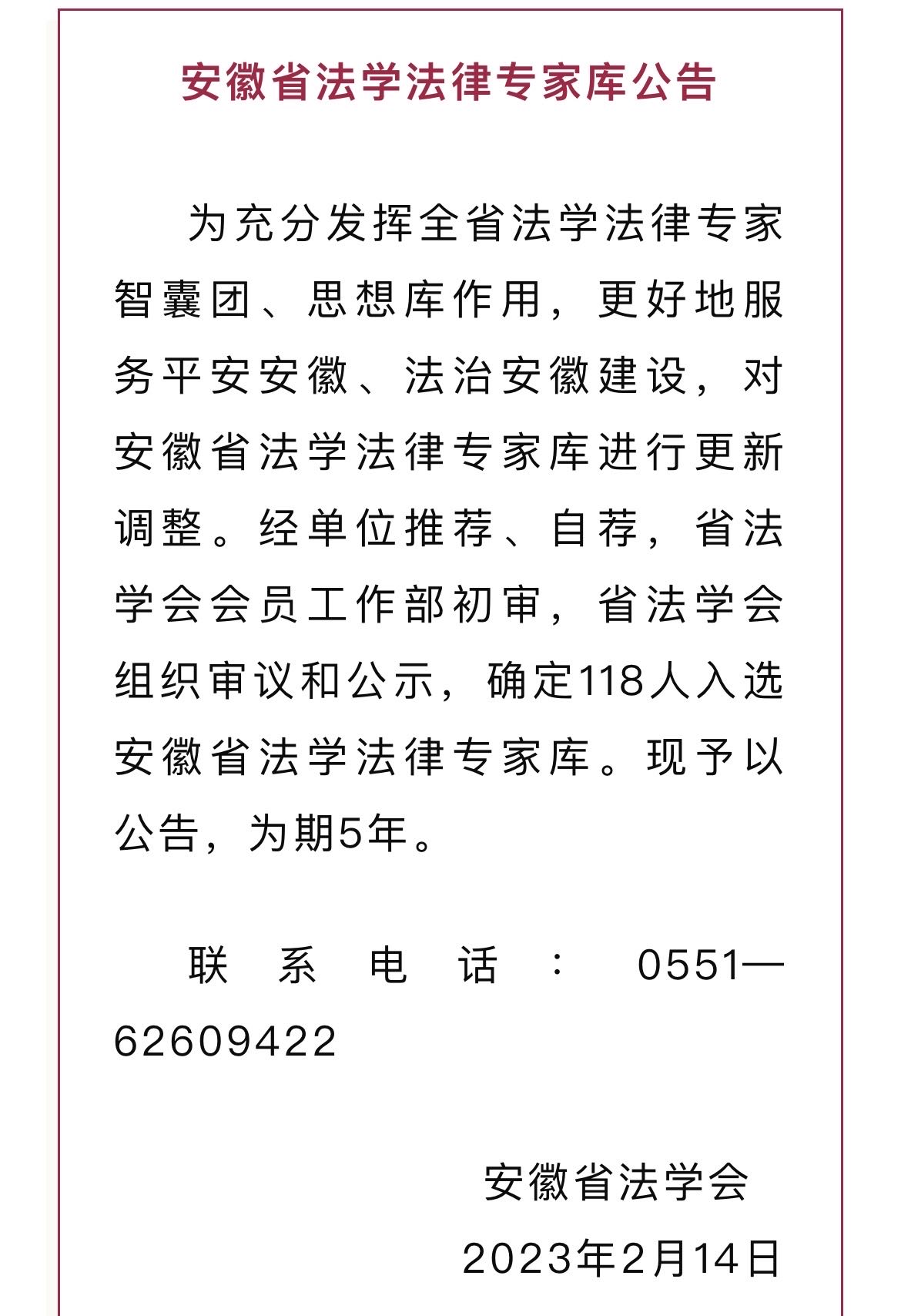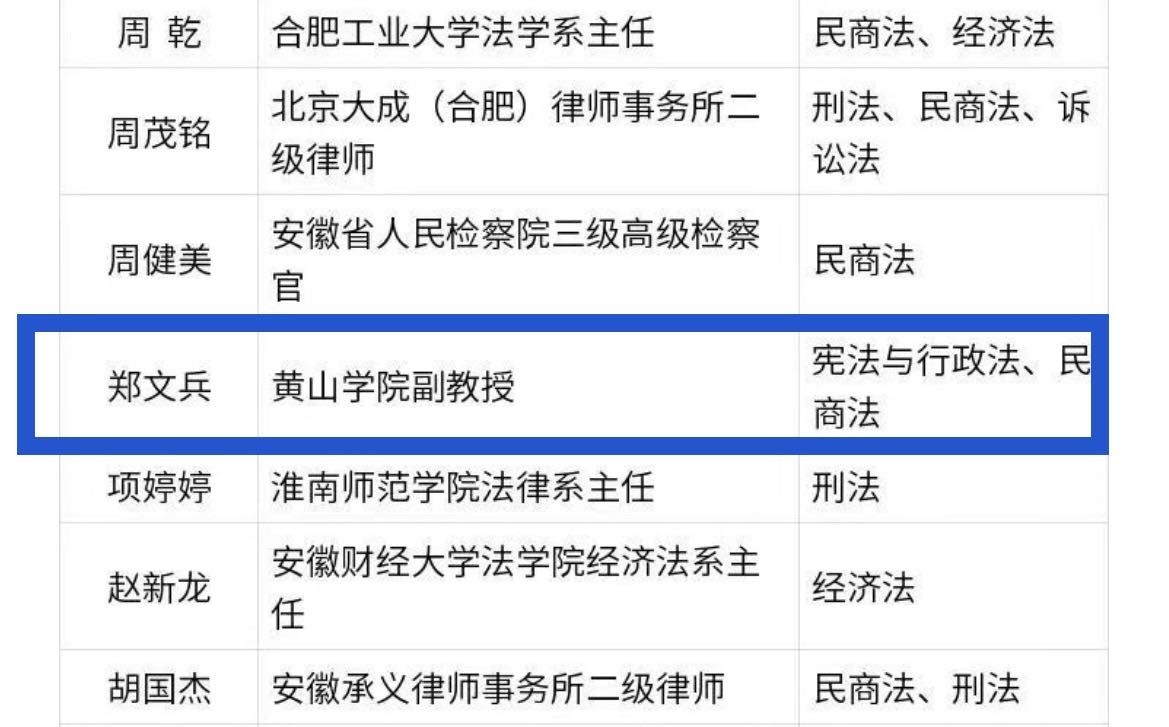 近日,安徽省法学会发布了“安徽省法学法律专家库公告”,确定118人入选安徽省法学法律专家库。我院法学副教授郑文兵入选宪法与行政法、民商法类法律专家库名单。
