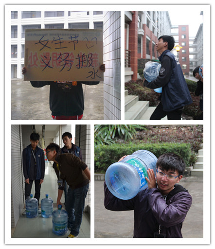 义务送水一直是东软女生节的特色项目,平时,学生宿舍的饮用桶装水是放在每栋宿舍的1楼宿管处,女生需要喝水时往往得全体出动。要是住在7楼的,就真的是情愿煮自来水都不去搬桶装水了。而在女生节,一帮身强力壮的男生会等在一楼“水库”,只要有女生来买水,立马送货上门。女生们也不客气,一张口就是五六七八桶,恨不得让男生把一个学期的饮用水都搬够。