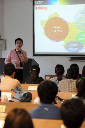 本网讯(记者 严剑琳)4月18日下午2点整,索尼(中国)有限公司校园专场招聘会在我院B201室举办。由广州地区的部门负责人何伟成担任本次招聘会的讲师。招聘会吸引了众多学生的关注,到场参加的学生不仅有前来应聘的同学,还有希望了解就业形势和学习应聘经验的同学。