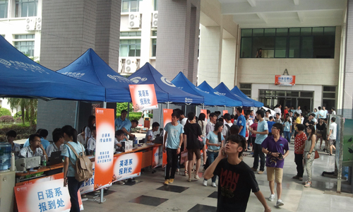 AB座教学楼是新生报到的“主战场”。计算机系、信管系、数字艺术系、英语系、日语系、国际合作部摆开“阵势”,迎接新生。