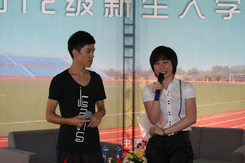 (本网讯 记者 李惠旋)“你想成为一个什么样的人,未来的你将是怎么样的自己”, 黎诗依然记得6年前的这个时候自己坐在体育馆的最后排,杨院长在台上进行新生教育时说过的话,并把这句话铭记于心,在今天,在 当初杨院长站立的位置,与2012级信管系和数艺系近千名新生分享“自己是一个怎么样的人”。