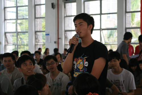 在分享会的现场,黎诗还鼓励在场的新生勇敢的站在台前介绍自己,“不要错过每一次介绍自己的机会,在场的每个人都可能在你以后的人生路上给你帮助“,在黎诗的鼓励下,十余名新生纷纷站上台,介绍了自己,说出了自己的大学目标和理想。