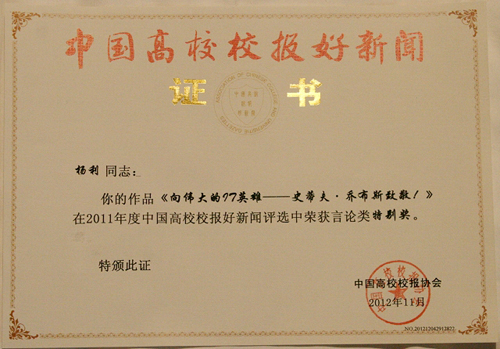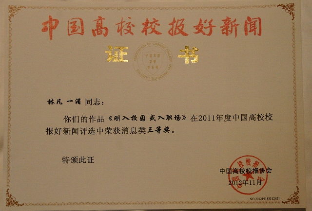 2011年度,全国共有461家高校校报参加年度好新闻评选,报送消息、通讯、摄影、言论、版面2163篇(个),经过31位评委的认真、严格评选,各项大奖“尘埃落定”。其中,我院院长杨利博士的言论《向伟大的IT英雄——史蒂夫.乔布斯致敬!》荣获“言论类特别奖”;我院校报指导老师卓尔吉一湄和学生林凡采写的消息《刚入校园 或入职场》荣获“消息类三等奖”。