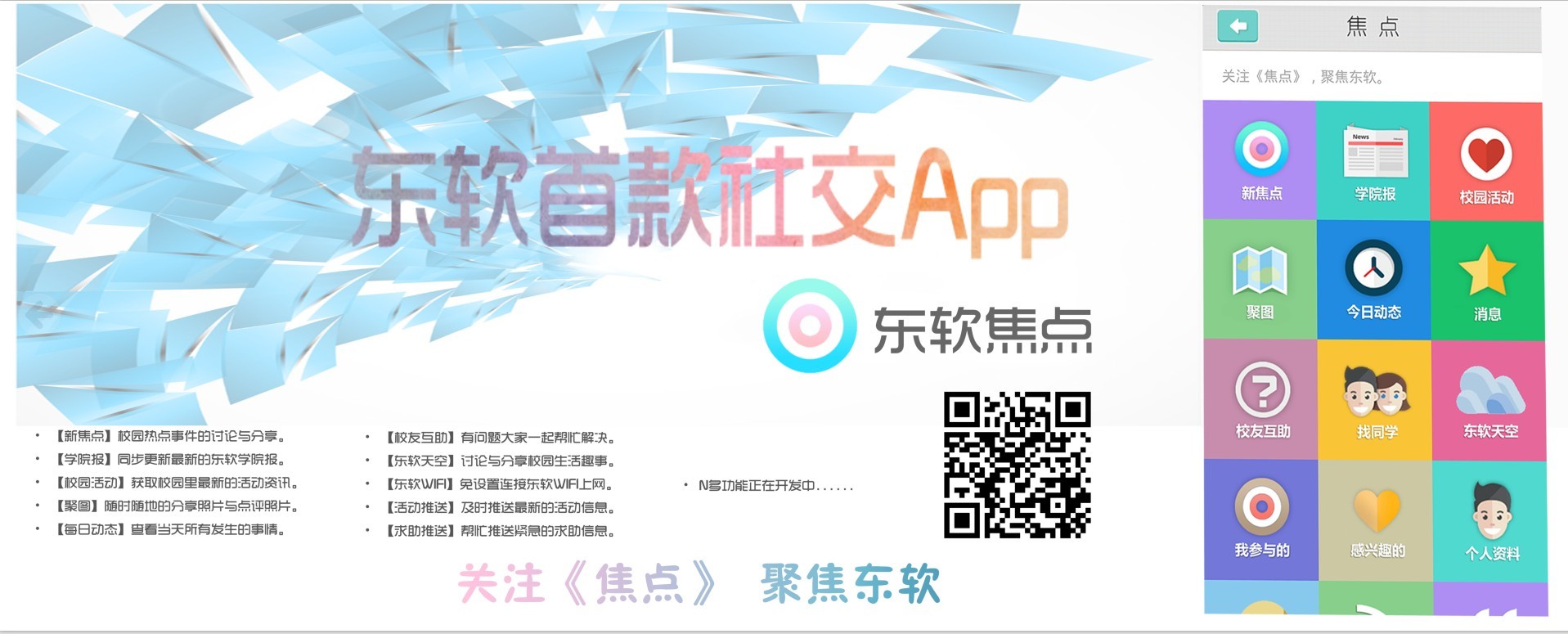 看到这里是不是已经蠢蠢欲动想下载下来焦点一下呢?是不是想加入焦点这一个大家庭,让自己在东软成为一个焦点呢?只要在学校A、B栋外面和校道上的通知栏上扫描海报上的二维码就可以下载了,或者点击进入《焦点》的官网进行下载 。