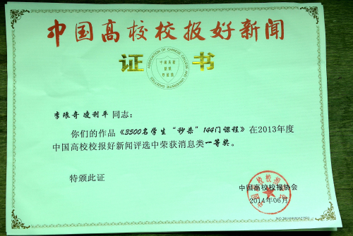 中国高校校报协会于2014年3月启动好新闻的报送和评选工作,对2013年度中国高校校报的新闻作品进行评选。本次评选,共有来自全国28个省市自治区的624所高校报送的2974篇作品参评。经过中国高校校报好新闻评委会的评审,我院李琅奇、凌利平同学采写的《3500名学生“秒杀”144门课程》荣获消息类一等奖;一湄采写的《三千毕业生校内逛人才集市》荣获消息类三等奖;罗修坤拍摄的《军训女生铿锵有力的呐喊》荣获新闻摄影类三等奖。