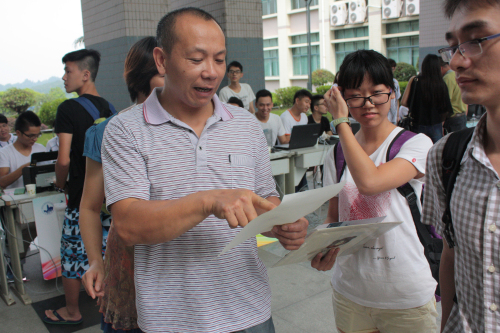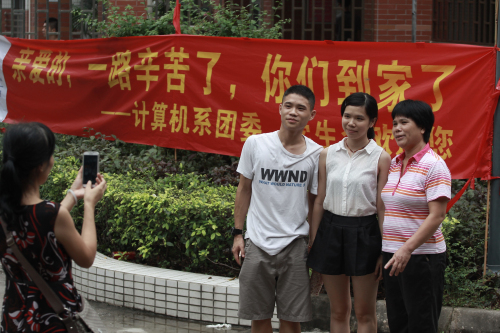 来自汕头的王潇戴和另外两名高中同班同学一起考入数字艺术系视觉传达艺术设计(本科)专业,她在我院读大三的表哥帮她把行李搬到五楼宿舍后,潇戴就让家人去食堂吃早餐,自己整理宿舍。潇戴就读高中时曾在学校记者站工作,性格非常外向,不到一小时她就已经和同寝室来自广州番禺的郭晓裕成了无话不谈的“老朋友”,潇戴和晓裕有许多共同点,她们都是出于兴趣选择了这个专业,而且都获得了家长的支持。在问及是否会舍不得离开父母时,她俩不约而同说道:“不会,大学要学会独立,学会自学,大学靠自己。”潇戴希望毕业后能在珠三角有好的发展,“我觉得学校的好坏要看校风,看学习氛围,看图书馆的条件,这些要比住宿条件更重要。”