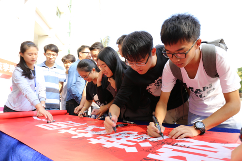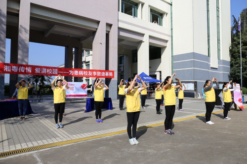 湘粤传情,爱满校园,募捐活动从11月23日至25日持续3天,在行政楼、教学楼AB座前、学生宿舍1栋和18栋前设置4个募捐点,共募得师生善款54623.6元。