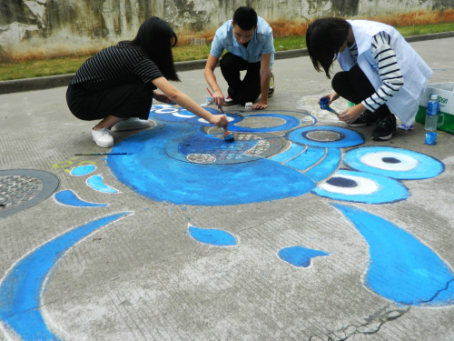本网讯(记者 陈东涛 毕锦萍 刘惠勋 张柳珏 吴杰松)12月2日下午,宿舍区和教学区惊现皮卡丘、天线宝宝、海绵宝宝、哆啦A梦、樱桃小丸子、hello kitty、鲸鱼、地球等涂鸦,原来这不是外星人袭击东软,而是学工部主办,自管委承办的沙井盖涂鸦大赛,近百名同学用水粉颜料涂鸦出上述一道道色彩斑斓的美景。