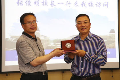 座谈交流会后,张俊明校长向杨利院长等人分别敬献了哈达,杨利院长向张俊明校长等人赠送了学院升本纪念币。