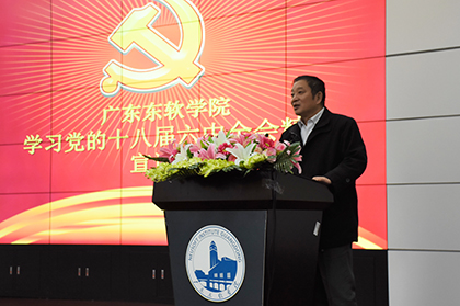 本网讯(记者 李惠旋)为进一步推动全院上下学习、宣传、贯彻党的十八届六中全会精神,掀起学习党的十八届六中全会精神的热潮,把全体党员干部的思想和行动统一到中央、省委和市委决策部署上来,坚定不移推进全面从严治党,12月28日,我院党委邀请佛山市委宣传部常务副部长陈新文同志,专题宣讲党的十八届六中全会精神。