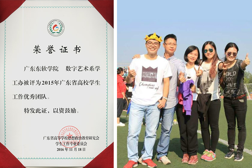 本网讯(通讯员 张亚川)日前,从广东省高等学校思想政治研究会学生工作专业委员会传来喜讯,经各高校推荐、网络展示(投票)、委员会组织评审、公示等环节,我院数字艺术系学工办荣获“2015年广东省高校学生工作优秀团队”荣誉称号。