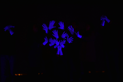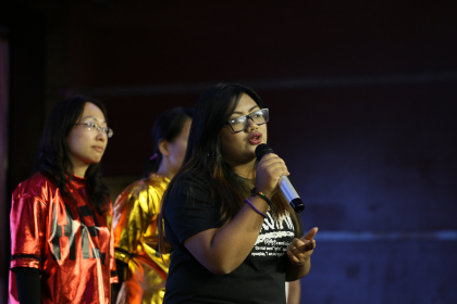 17时40分,一曲《夜空中最亮的星》响起拉开了整场晚会的序幕,优美的手影舞伴随着诗朗诵,展现了图书馆的义务馆员和老师们饱满的情绪和积极的态度,也将观众的情绪调动了起来。