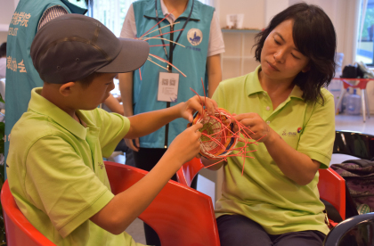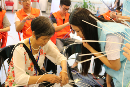 在藤编讲解环节,来自佛山市南豪藤编艺术展览馆的冯桂英和杜艳流现场演示藤编工艺品的制作方法,并现场指导我院志愿者和新西兰的华裔家庭共同完成藤编,从最开始简简单单的几条藤蔓,最后变成小朋友们喜欢的花篮、笔筒,别具创意的保龄球球瓶等等。今年已经69岁的冯桂英说道:“以前编制藤编是为了养家糊口,现在不一样了,我现在更加想的是把这种技艺能继续流传下去”。