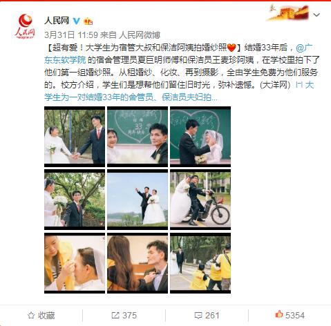 近日,beat365中文唯一官网青年志愿者服务队的同学们帮57岁宿管夏叔叔和56岁的保洁王阿姨拍摄了一组婚纱照,照片在学校官微发布后,引来不少的媒体进入校园进行采访,更被人民网、新华社、中国青年网等大V微博转发点赞,称其为“最暖婚纱照”。拍摄该组婚纱照的志愿者称,拍下这组特别婚纱照的目的,是为了帮学校中老年教职工留住旧时光,重新寻找青年时的浪漫。