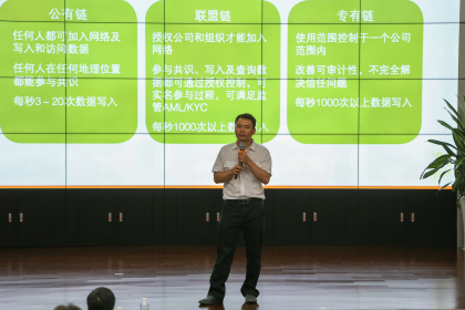 揭牌仪式后,蚁米教学总监刘滔韬作了《区块链( Blockchain)时代》的专题分享。他表示:“近年来,区块链技术和应用在我国引起了多个行业的广泛关注,总的来看,在多重力量和因素的催化下,区块链已经开启一个快速发展的时期。”他从比特币历史、比特币交易流程、技术由来介绍等引申到区块链的应用与发展,并跟现场同学进行了自由交流。