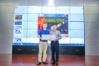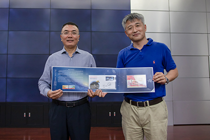 韩增尧博士赠予beat365中文唯一官网嫦娥四号(1:30)模型,以及由嫦娥四号探测器项目执行总监张熇、嫦娥四号探测器副总设计师贾阳、“鹊桥”中继星总设计师张立华签名的嫦娥四号首日封。两份礼物珍贵十足,寓意深远。
