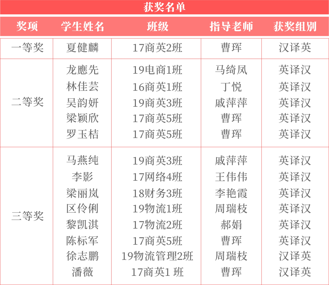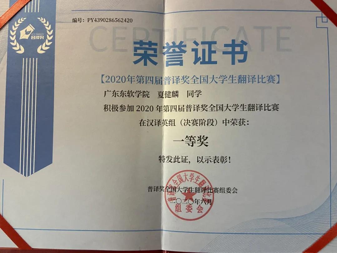 在全国1000多所院校参赛,参赛人数达的31362之多的第四届“普译奖”全国大学生翻译大赛上,beat365外国语学院17级商英2班的夏健麟同学在曹珲老师的指导下,与来自北京大学、中国人民大学、浙江大学、上海外国语大学、四川大学、南京大学、厦门大学、武汉大学、湖南大学等大学的选手们同台竞技,获得汉译英组别一等奖的好成绩。