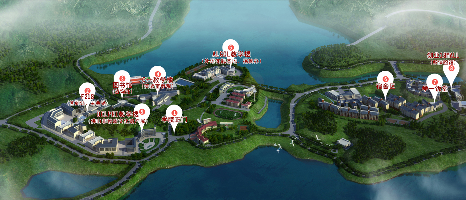 学院A、C、E、F座,图书馆、体育馆、运动场、宿舍区、学一饭堂、18MALL