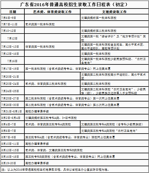 广东省2016年普通高校招生录取工作日程表(初定)